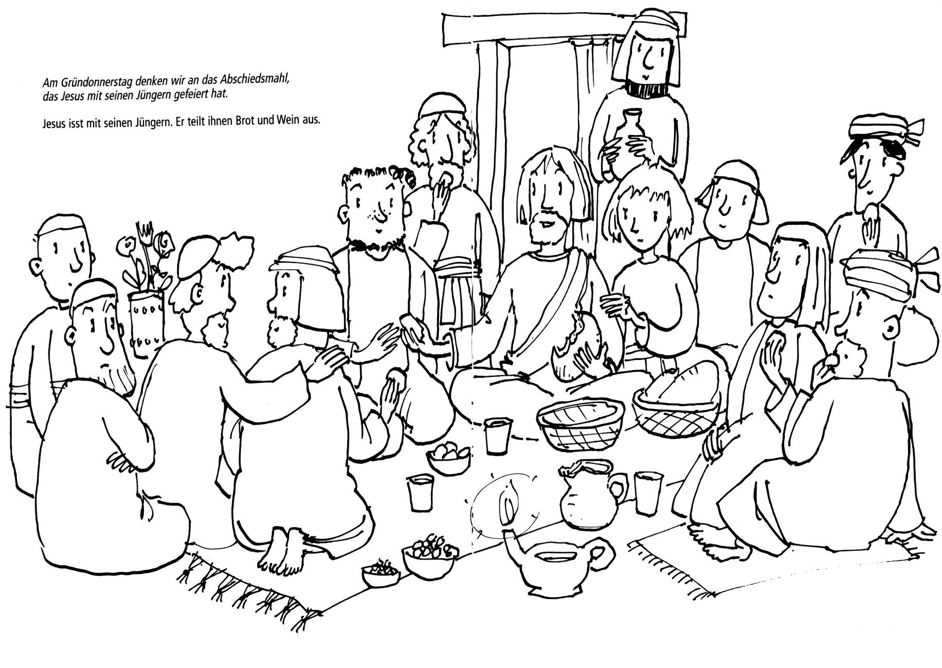 In Jerusalem teilt Jesus mit seinen Freunden (den Jüngern) Brot und Wein. Es ist ein ganz besonderes Essen. Man nennt es auch Abendmahl.