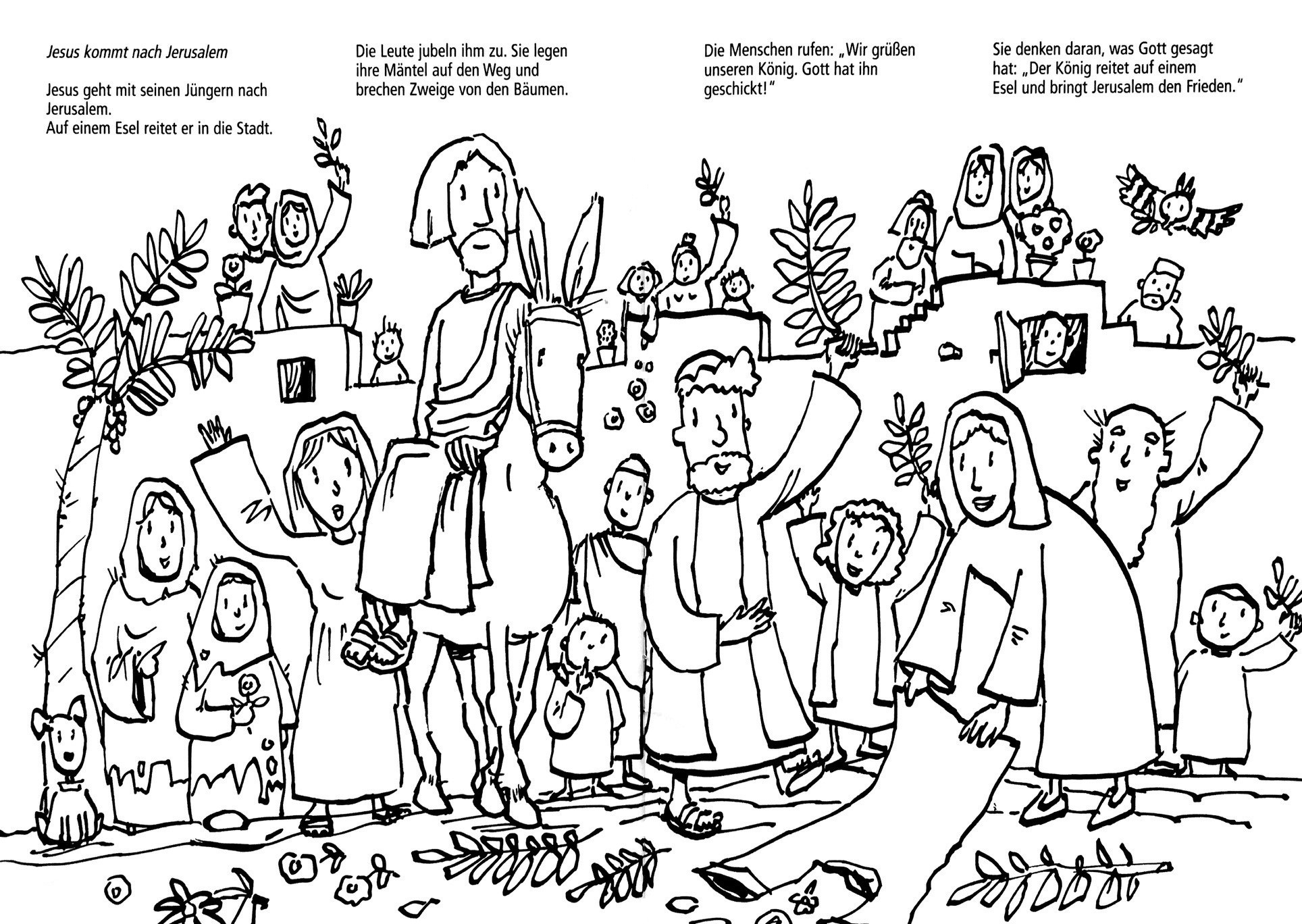 Die Leute sehen Jesus kommen. Sie breiten ihre Mäntel vor ihm auf der Erde aus. Sie brechen Zweige und Palmenwedel von den Bäumen und legen sie auf den Weg.