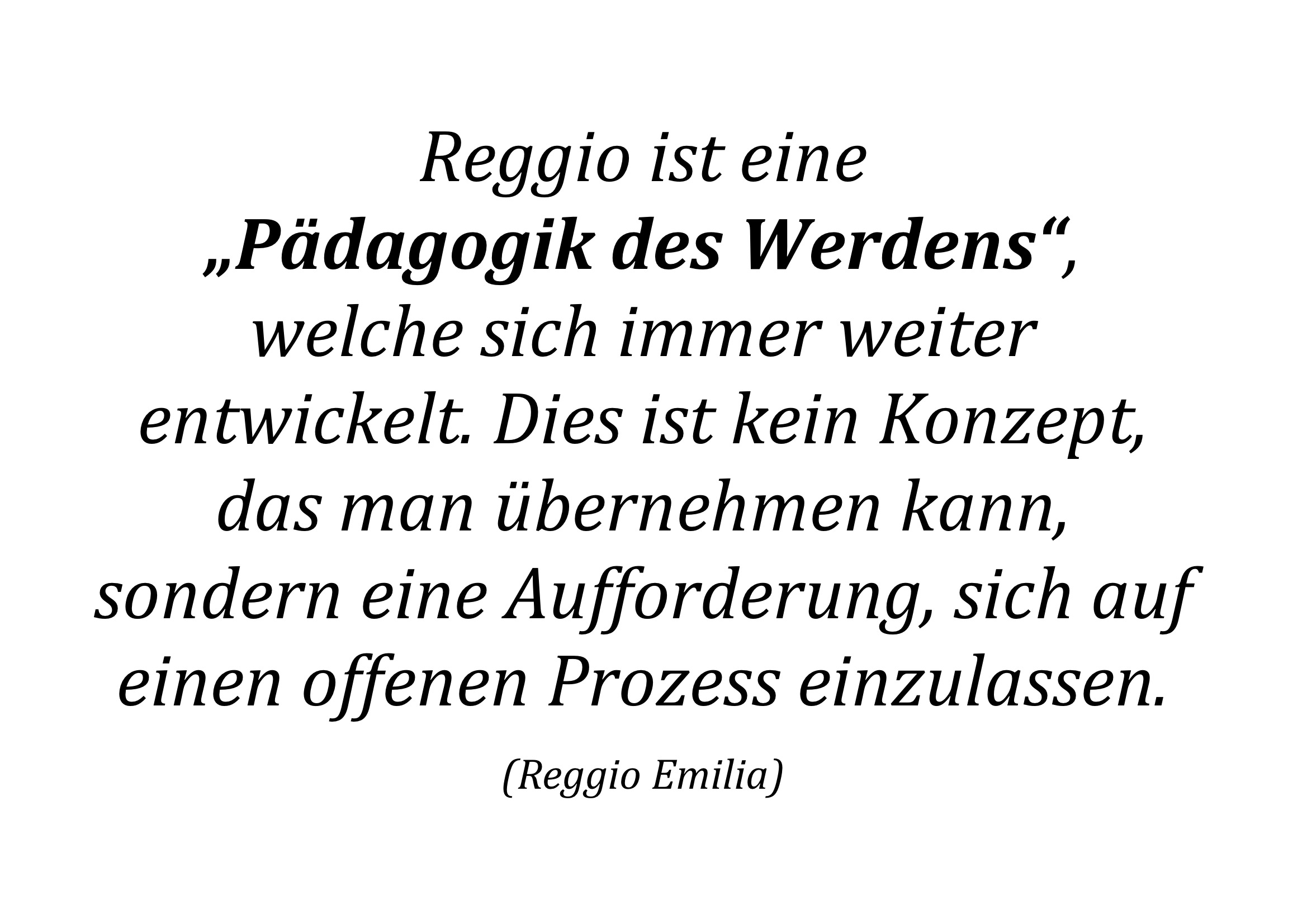 Als vierten Schwerpunkt sehen wir die Inspiration durch die REGGIO-Pädagogik. Sie basiert auf der Annahme, dass jedes Kind von Anfang an in der Lage ist, sich im sozialen Kontext selbst zu bilden und mit seiner Umwelt auszutauschen. Die Kinder sind somit Konstrukteure ihrer individuellen Wirklichkeit und Entwicklung. Als Ko-Konstrukteur fungiert die Gemeinschaft. Als „dritter Erzieher“ bekommt die bewusste Raumgestaltung eine wichtige Rolle. Sie wirken als reichhaltige Umgebung, die den Kindern sowohl Anregungen und Herausforderungen, als auch Geborgenheit und Rückzugsmöglichkeiten bieten.